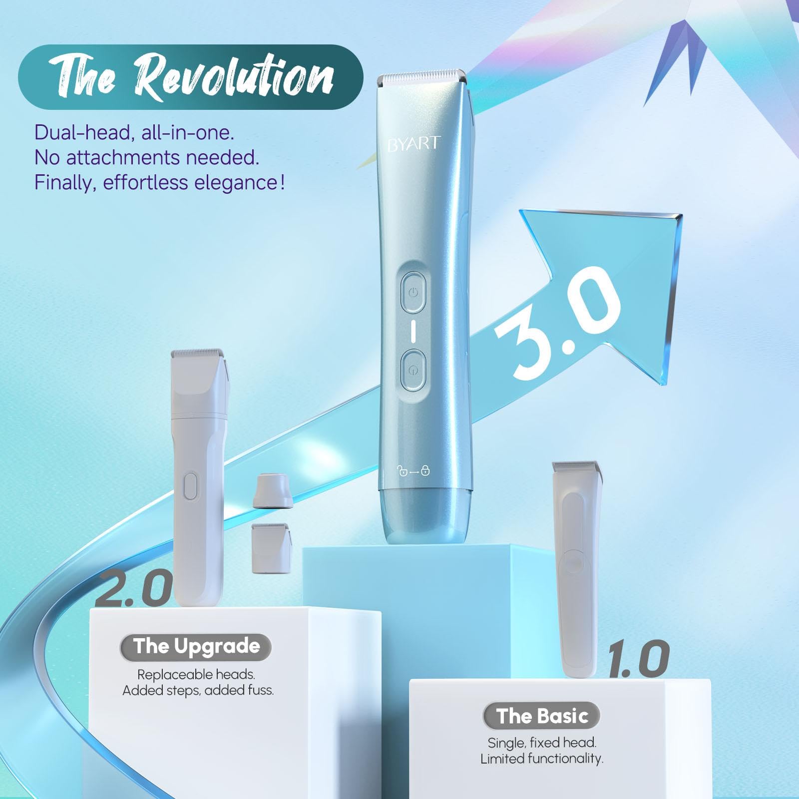 - 🌸【ALL-IN-ONE DUAL HEAD DESIGN】 Why own two separate trimmers? BYART bikini shaver for women combines a precision body hair trimmer and a gentle facial hair remover in one compact tool. No more searching for the right device. Whether you need a quick touch-up or a full grooming session, this electric shaver makes it effortless.