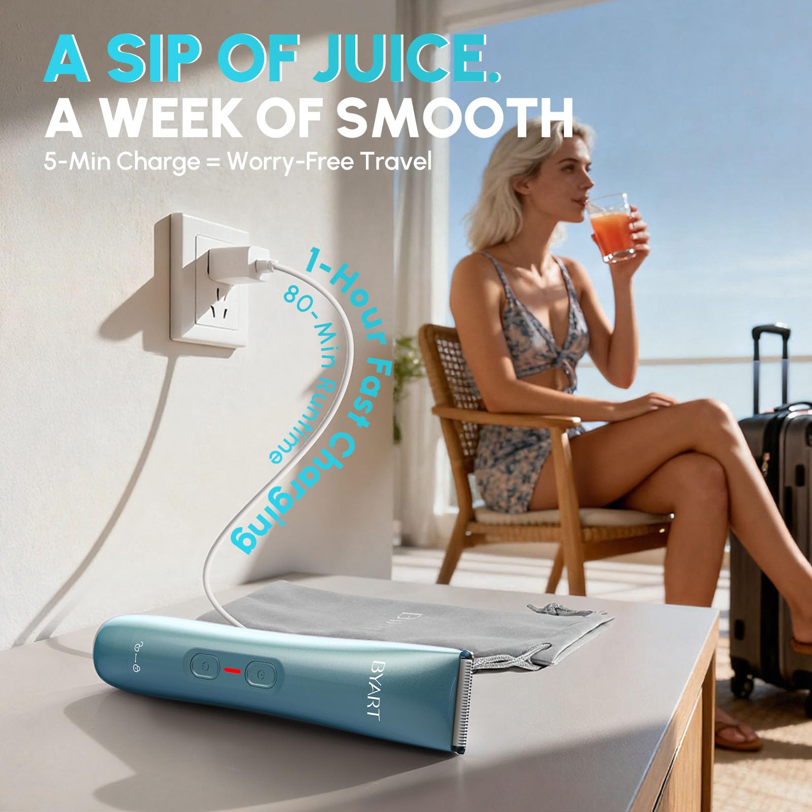 - ⚡【5-MIN FAST CHARGE FOR TRAVEL】 A single cup of juice is all it takes!. A quick 5-minute charge is enough for a full grooming session—perfect for a spontaneous beach trip or pre-party prep. One-hour full charge covers 80 minutes for weeks of carefree grooming.