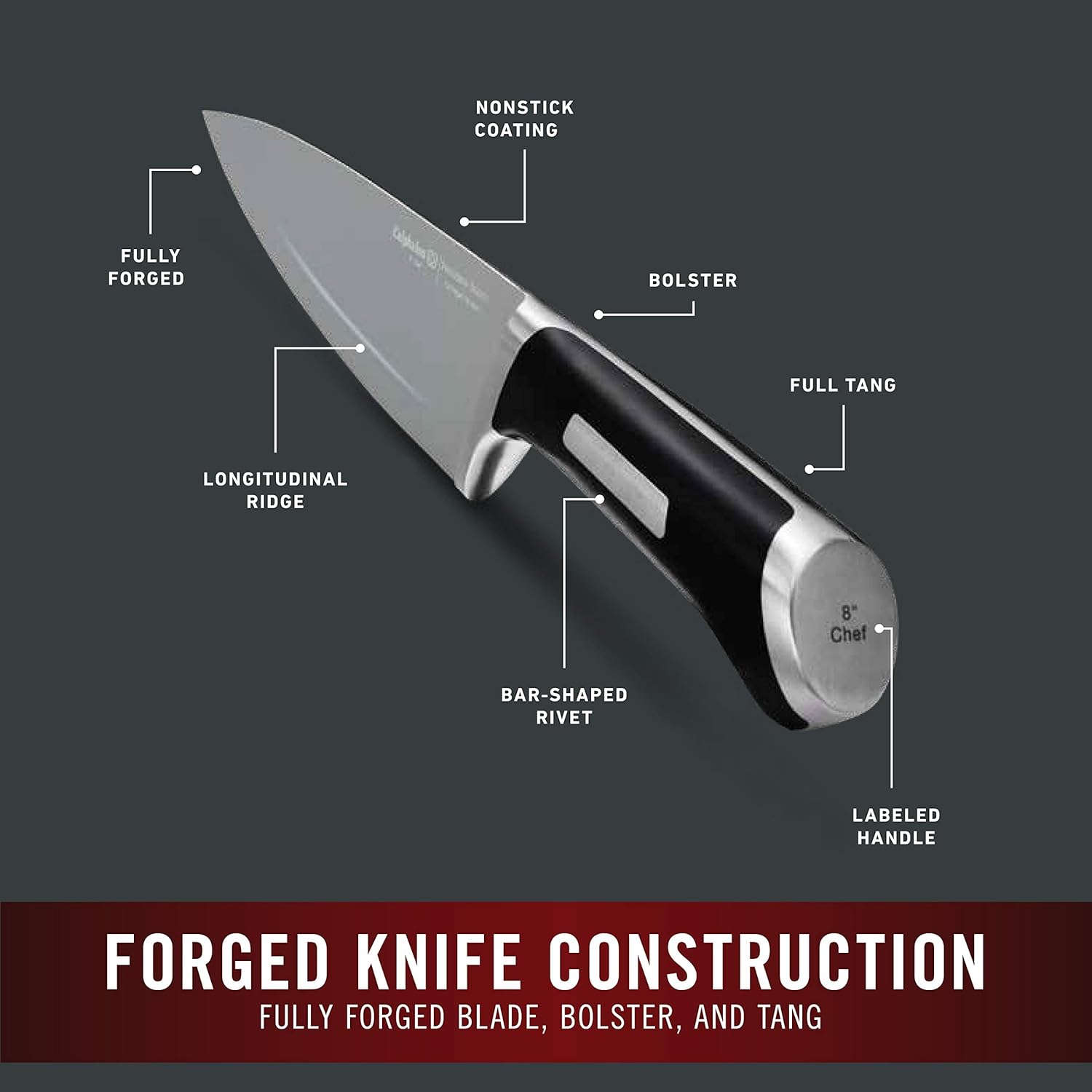Tired of food always sticking to your knife while you cut? The Calphalon precision sharpening nonstick 13 piece cutlery set is a line of premium cutlery that features a uniquely designed nonstick-coated blade with a longitudinal ridge that prevents food from sticking—making food prep easier and saving you time.