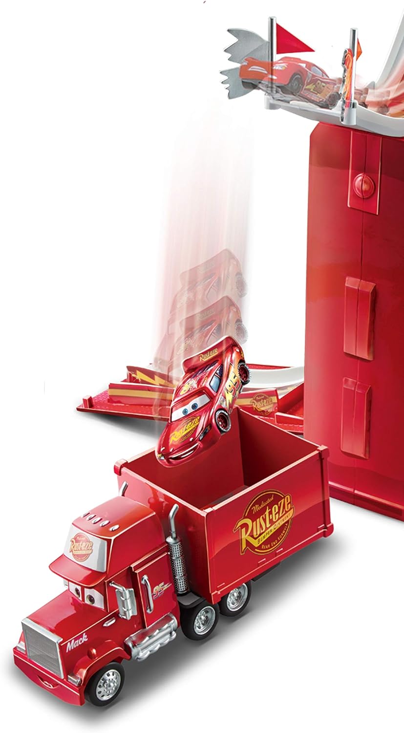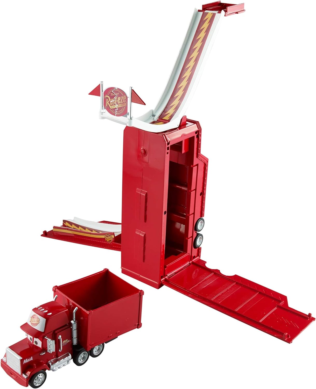 Fans, enjoy multiple ways to play with Mack and this cool, transforming, training and stunt set! First, Team Rust-eze's trusty hauler delivers hearty push around fun. Then, you can load up favorite character vehicles inside and drive to your next race. Park his truck and start your stunt training! With pop and drop action, you just press the button on Mack's infamous trucker cap to launch cars off his sky-high ramp! Aim for the target. Drive around and launch again until you nail the mark like a pro! When training ends for the day, fold the set up until your next big adventure. This Mack Training Center also connects to other Story Sets for even more Disney Pixar Cars movie-themed excitement. Sold separately, subject to availability.