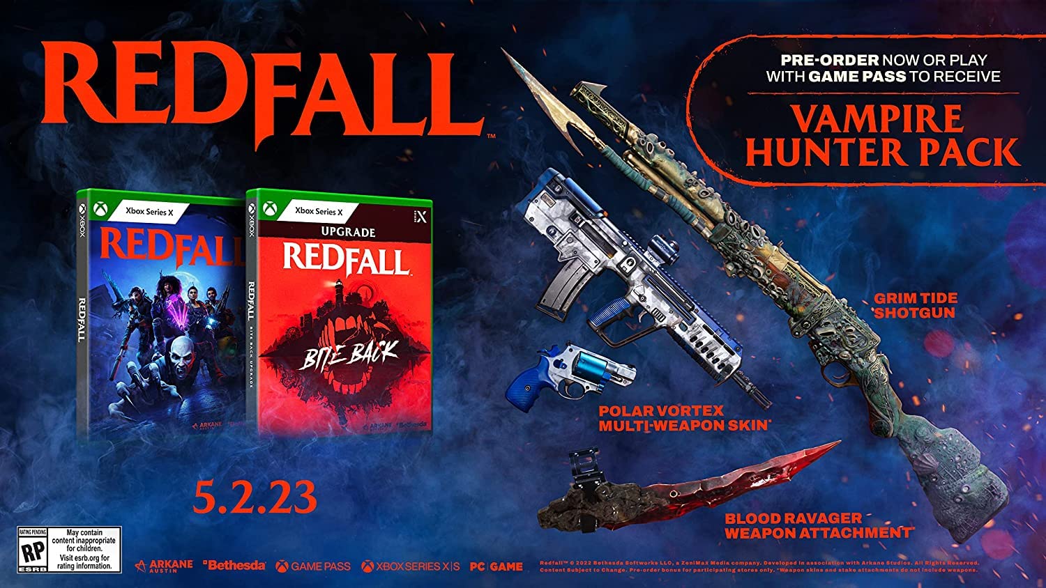 Redfall is an open-world, single player and co-op FPS from Arkane Austin, the award-winning team behind Prey and Dishonored. Continuing Arkane’s legacy of carefully crafted worlds and immersive sims, Redfall brings the studio’s signature gameplay to this story-driven action shooter. Pre-order to receive the Vampire Hunter Pack, including: - Level 2 Unrivaled Grim Tide Shotgun - Polar Vortex Multi-Weapon Skin - Blood Ravager Stake Weapon Attachment. FEATURES: Uncover the Truth, Take Back Redfall - The island town of Redfall, Massachusetts, is under siege by a legion of vampires who have blocked out the sun and cut the citizens off from the outside world. Explore the open world and immerse yourself in a deep story campaign as you unravel the mystery behind the vampires’ appearance. Ally with a handful of survivors against the creatures threatening to bleed the town dry. Slay Alone or Squad Up - Redfall blends single- and multiplayer options seamlessly, allowing the player to venture into the darkness alone or to squad-up for up to four player co-op. You will collect an arsenal of specialized weaponry and customize your character with unique upgrades and abilities to suit your playstyle for guns blazing, stealth combat, and everything in-between. Unconventional Heroes Vs. The Night- Created by science experiments gone wrong and gifted with psychic abilities, Redfall’s vampires will challenge you and your squad to get creative. You will choose from a team of diverse heroes – each with their own character-specific abilities – to overcome the vampire legion and their maniacal followers. The Open World of Redfall - Redfall is a true Arkane experience set in a rich world that blends the familiar with the extraordinary. Redfall’s open world is handcrafted by the master level designers behind Prey’s Talos I space station and Dishonored’s Dunwall.