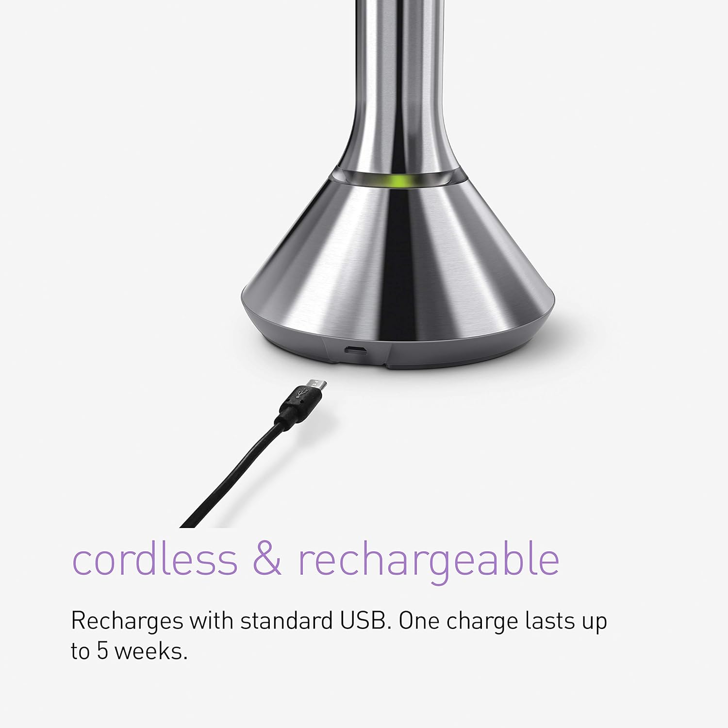 The simplehuman sensor mirror lights up automatically as your face approaches. Its tru-lux light system simulates natural sunlight, allowing you to see full color variation, so you'll know when your makeup is color-correct and flawless. The touch-control brightness gives you fast, intuitive control over a continuous range of brightness. And unlike traditional makeup vanity mirrors' bulb lighting, our long-lasting LEDs won't burn out or diminish even after years of use. The mirror is cordless and rechargeable – one charge lasts up to 5 weeks. 5x magnification — ideal for providing exceptional detail while still allowing you to see your entire face at once.