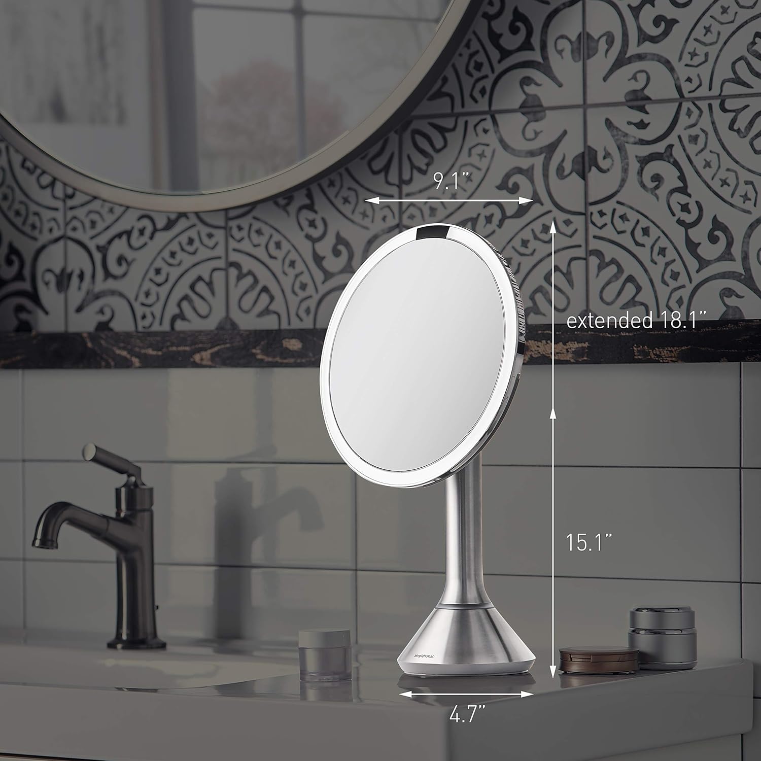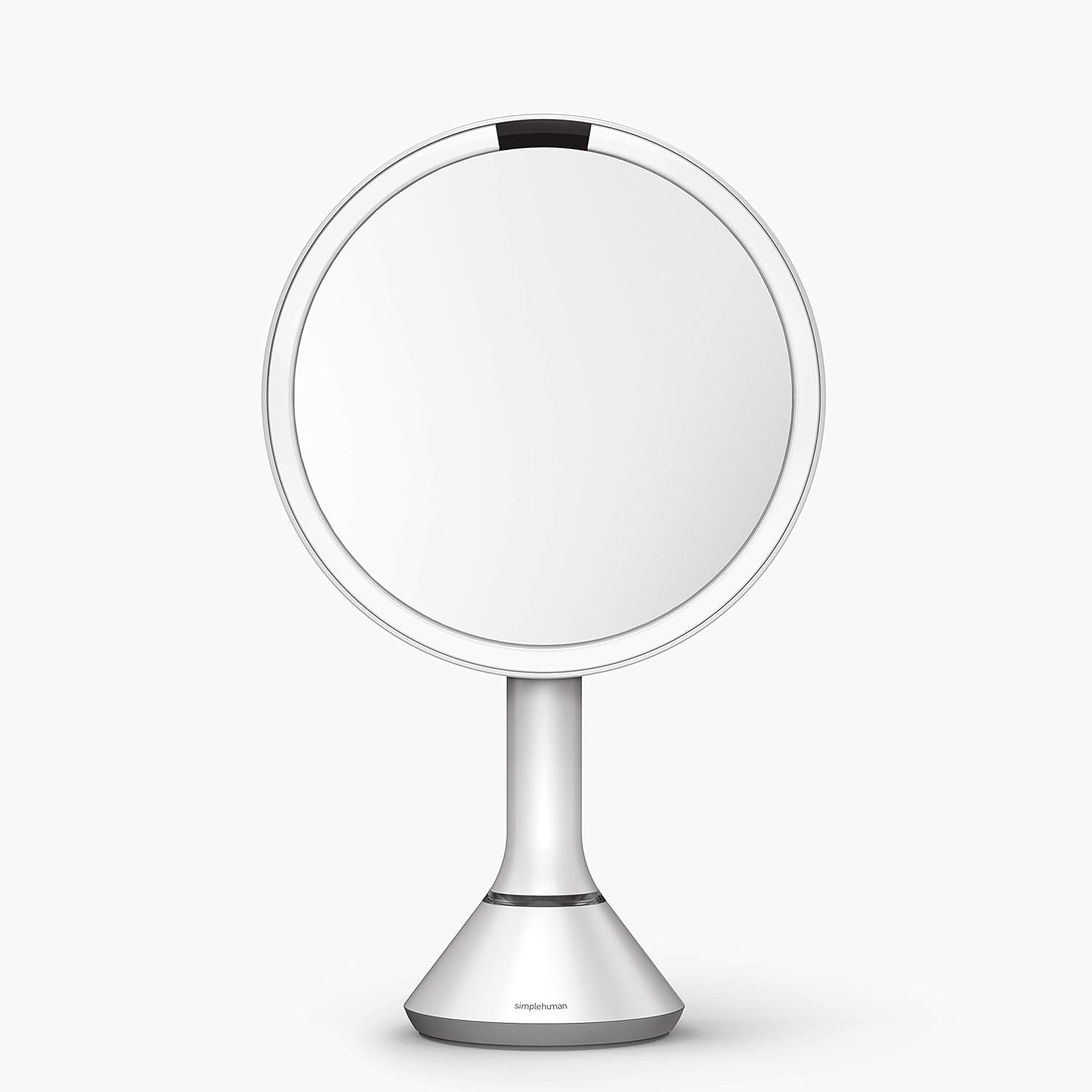 simplehuman 8" Round Sensor Makeup Mirror with Touch-Control Brightness, 5X Magnification, Rechargeable and Cordless, White Stainless Steel